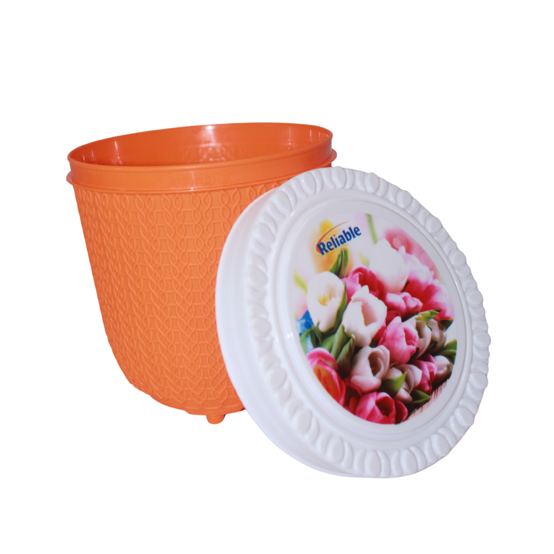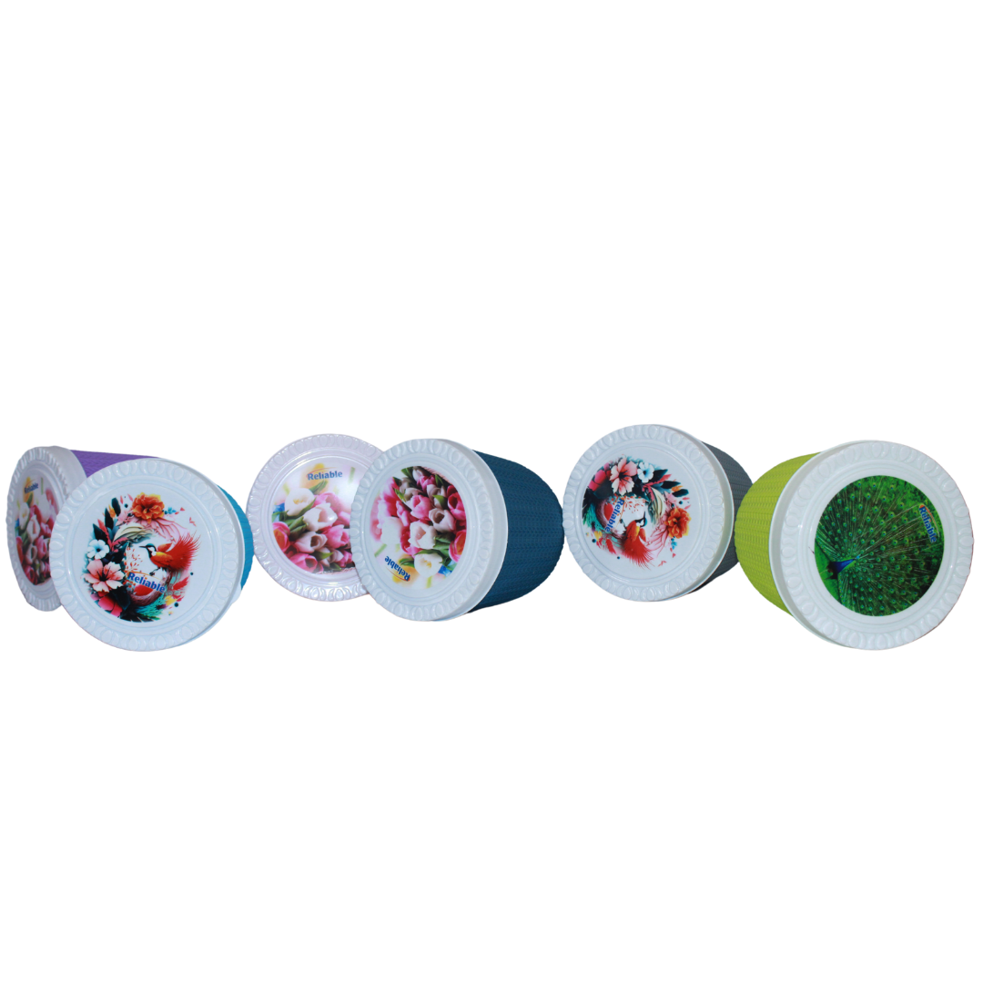 Description : Virgin Plastic container with pressing lid. Beautiful floral print on lid. Gift article for all functions. Available in 6 colors.