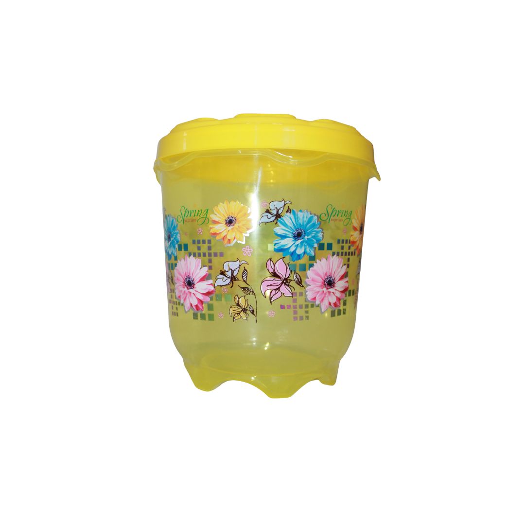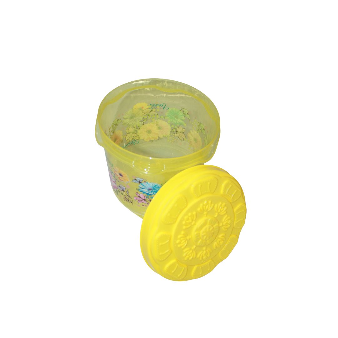 Description : Virgin Plastic Transparent container with floral print. Pressing lid. Gift article for all functions. Available in 3 colors